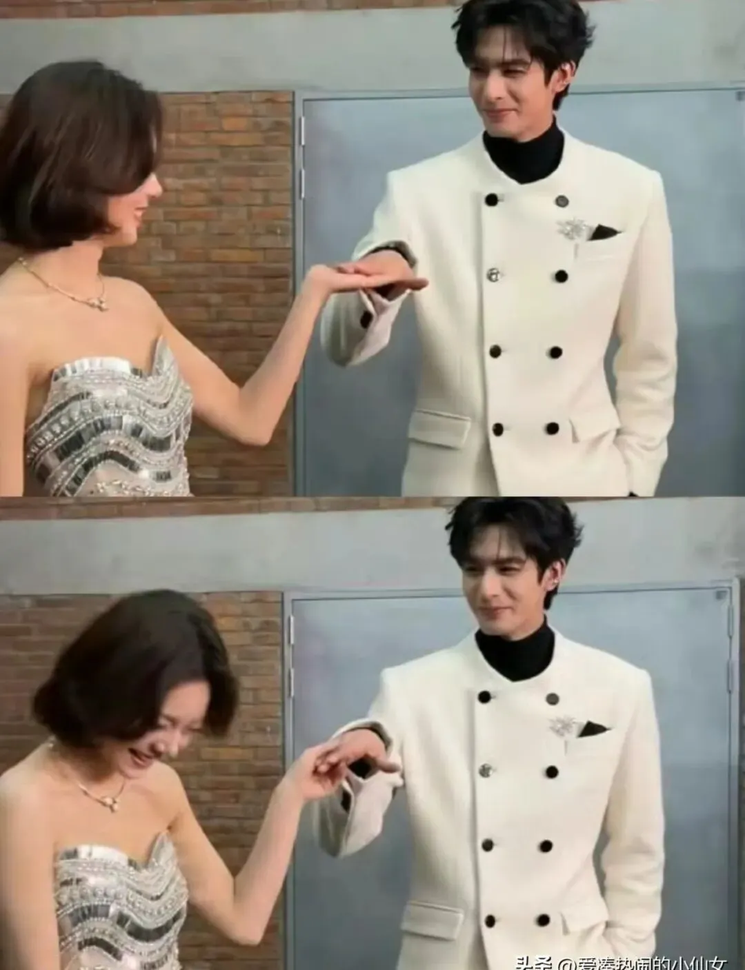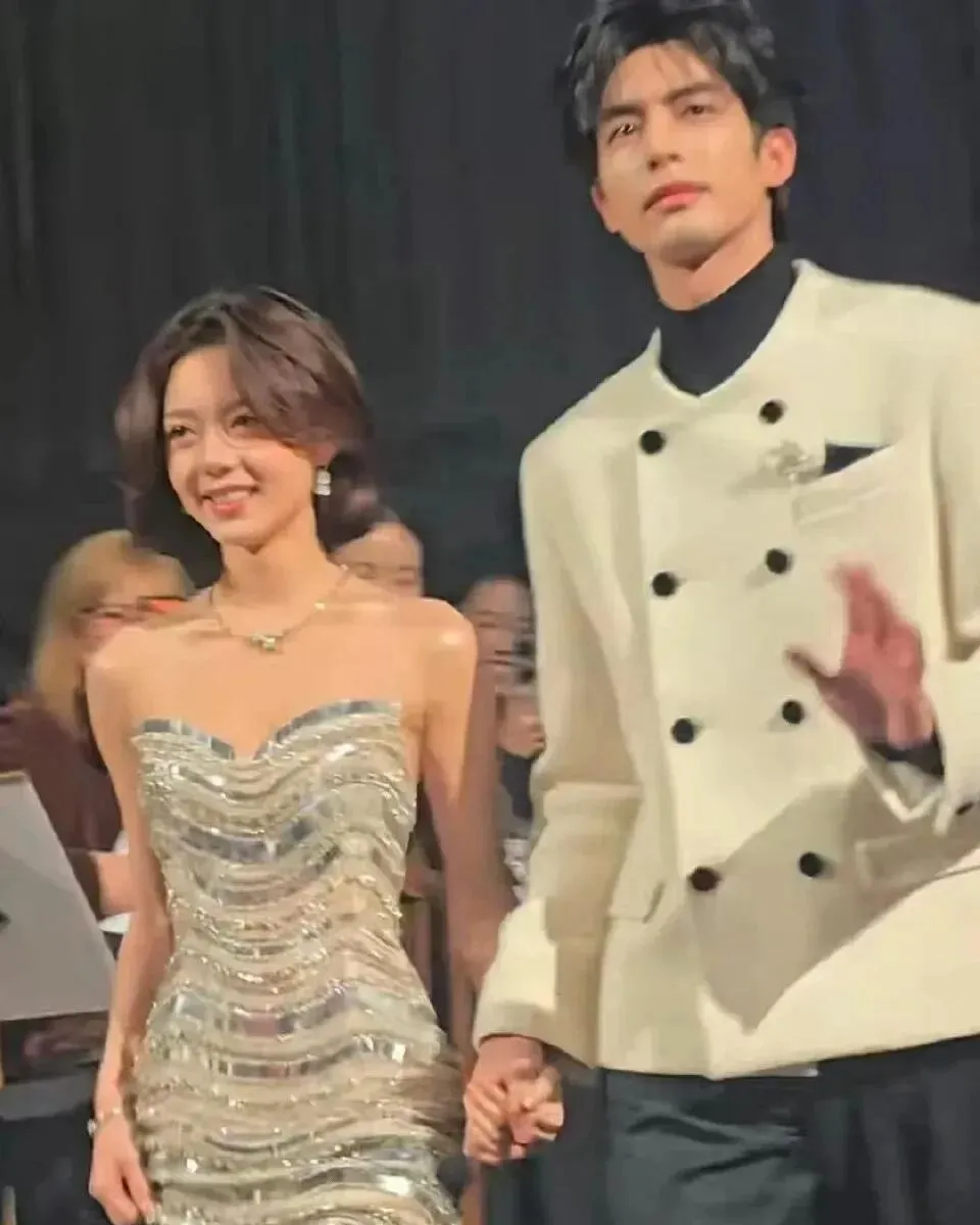 全场的镜头和目光瞬间被磁铁吸过去一样,转向他们。赵今麦那身HACCHIC COUTURE的银色镂空裙,和宋威龙身上那套Ernest W. Baker的白色排扣外套,无论是设计还是质感,都像是另一个世界的产物。他们甚至不需要做什么,只是自然地牵手、对视、微笑,现场的闪光灯就已连成一片白昼。他们毫不费力地拥有并定义了那个场域的焦点。