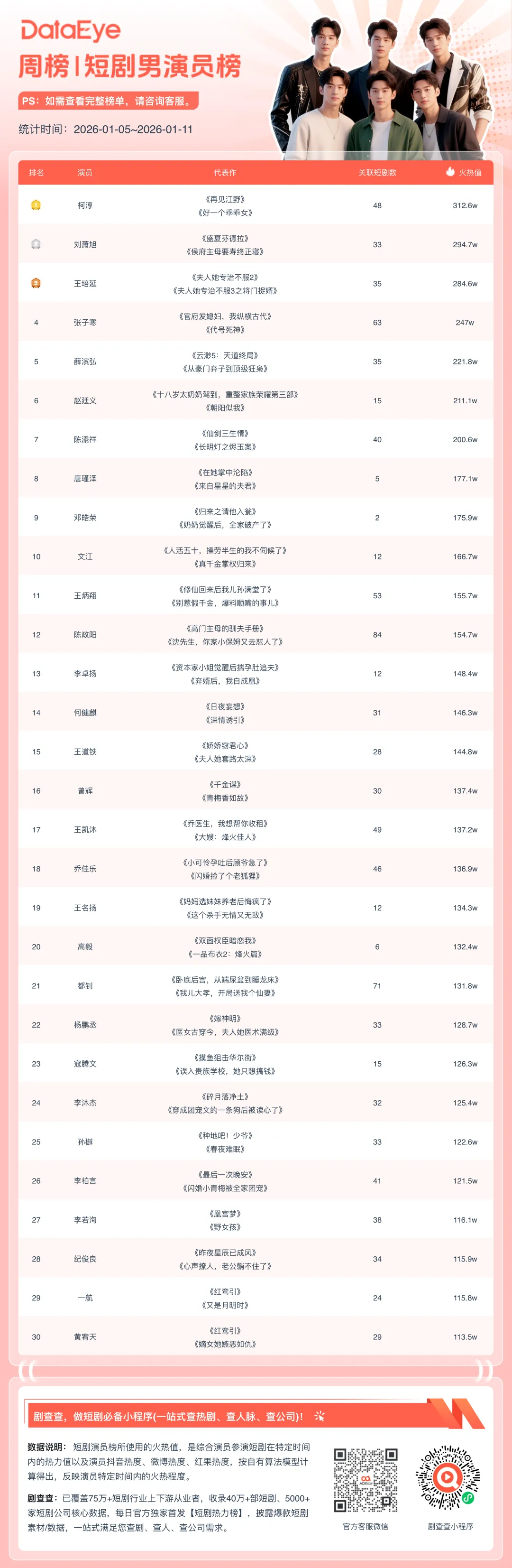 DataEye综合一周内演员关联的相关数据,定期发布演员榜——计算方式是基于DataEye微短剧热力值、红果热度、抖音粉丝数三个维度,以评估演员一周内火热程度。本期(1月5日-1月11日)DataEye微短剧男演员热榜,柯淳位居第一。柯淳近期一曲《午夜恰恰》唱跳舞台颇为出圈,虽无新剧上线,却带动此前播出的短剧,迎来新一轮收视热度。据悉,柯淳还受邀参与了 “2026央视网络春晚” 的录制,期待解锁全新舞台~刘萧旭第二,与吴刚老师搭档的《长路初心》1.10上线,开播三天破亿。刘萧旭突破以往角色,挑战反派,演技细腻扎实,表现亮眼。此外,刘萧旭待播剧《撕婚》预计1月23日,在快手平台上线。王培延第三,和余茵主演的《粉红王爷》1.14上线,播出次日登上DataEye红果热榜日榜TOP3,热度持续攀升。搞笑甜宠走向的轻喜剧,王培延、余茵这一对剧中CP相当机灵鬼怪,二人花式耍宝,拿捏各种搞笑名场面,男帅女美值得一看。薛滨弘近期多部新剧上线,其主演的《从豪门弃子到顶级狂枭》表现亮眼,跻身 DataEye 红果热榜周榜 TOP2,成近期男频爽文赛道黑马。此外,《云渺5:天道终局》的热播,也助其火热值飙升。二、DataEye微短剧女演员热榜