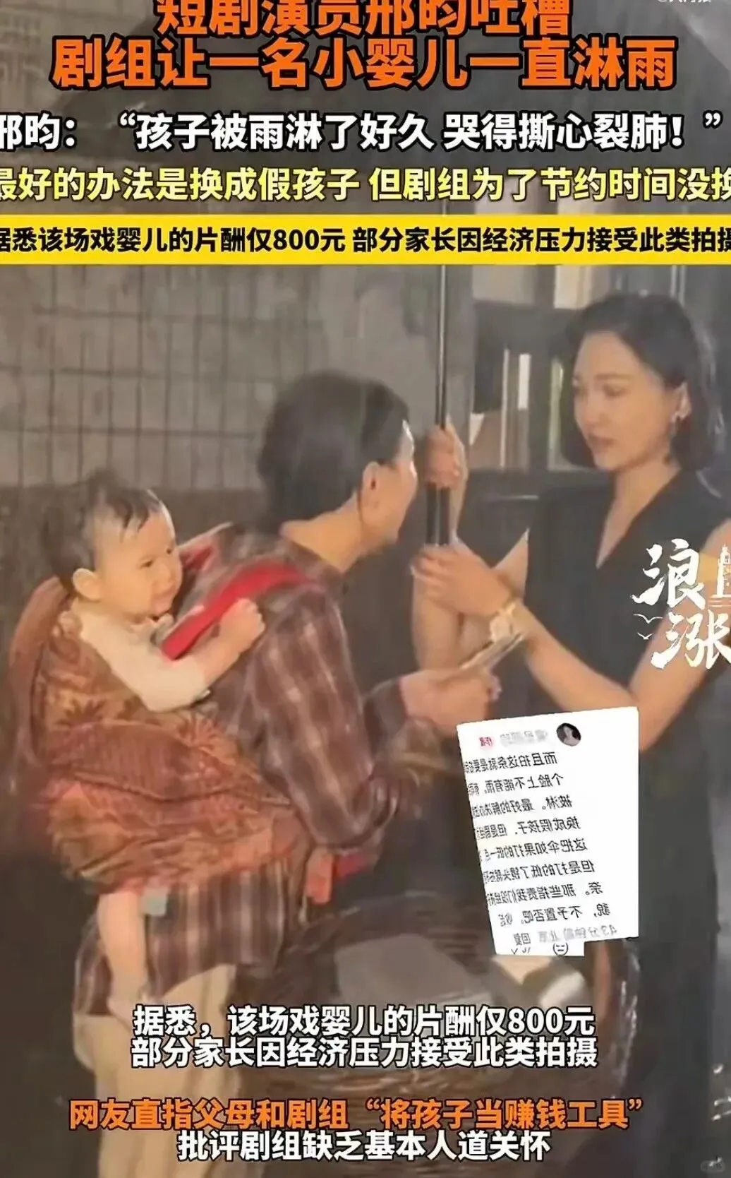 某剧组深夜拍戏时让一名婴儿在低温中淋人工暴雨半小时,片酬仅800元,引发全网对影视行业漠视儿童权益的愤怒声讨。