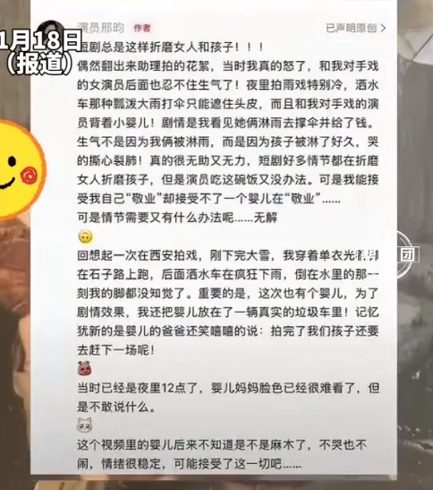 1月17日,一名短剧演员的吐槽引发全网热议,直指剧组拍摄缺乏人道关怀。该演员透露,剧组深夜拍摄雨戏,用洒水车制造瓢泼大雨场景。因她与对手戏演员需拍近景、面部不能沾雨,伞无法压低遮挡下方的婴儿。最稳妥的方案是拍近景时换假婴儿,但剧组为节省时间,坚持用真人婴儿拍摄。