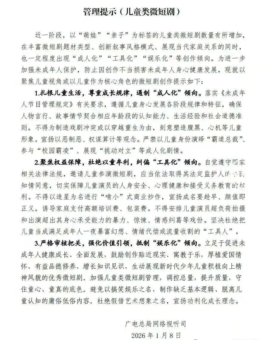 1月8日,国家广电总局网络视听司发布《儿童类微短剧管理提示》,其中明确要求:不得安排儿童演员超负荷拍摄,不得让儿童出演超出其身心承受能力的暴力、惊悚、情感纠葛等戏份。