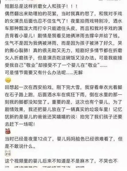 短剧演员吐槽剧组让婴儿一直淋雨,婴儿被淋了好久哭得撕心裂肺,最好的解决办法是换成假孩子,但剧组为了节约时间没有换小孩。