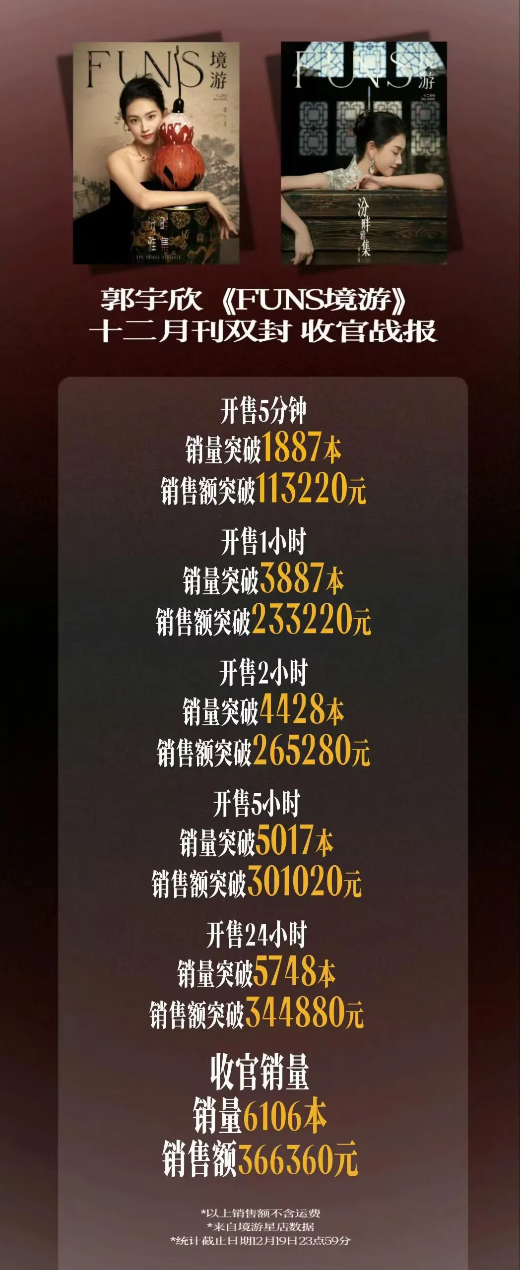 12月郭宇欣的商务表现也是值得一提。众所周知,杂志是一个明星粉圈消费力和明星商务价值的直观表现,杂志销量高,代表粉丝粘性高,花钱意愿强,而品牌也更愿意和这样的明星合作。