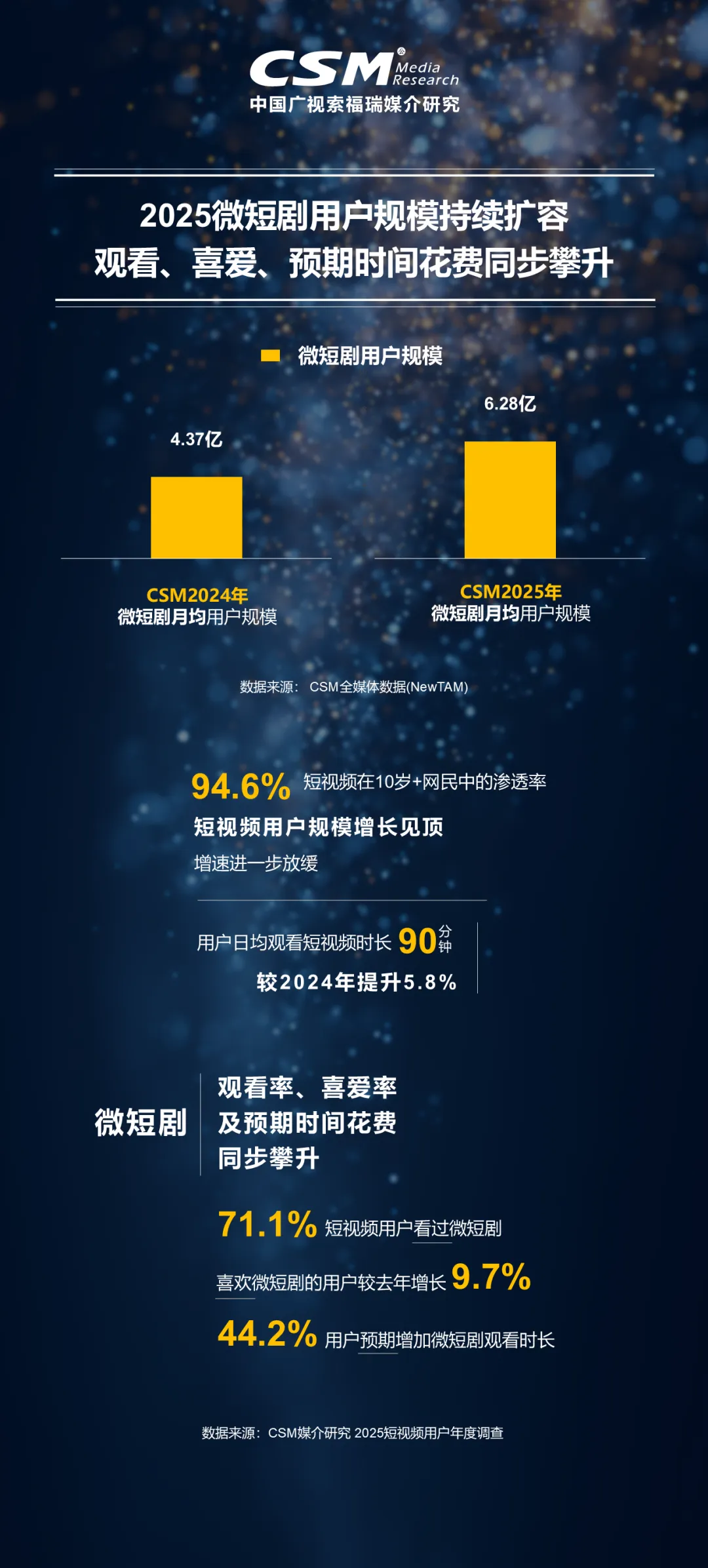 用户规模从2024年4.37亿飙升至6.28亿;“喜欢微短剧的用户”较去年增长9.7%;44.2%用户预期增加微短剧观看时长。在政策引导、企业入局扩容、市场与精品化驱动等多因素叠加下促成“减量提质”后重拾增长势能,微短剧备案数量同比增长20%达3182部;内容供给向都市、传奇等题材聚焦,而相关企业数量破10万家,直接间接带动200万岗位就业,价值效益凸显。