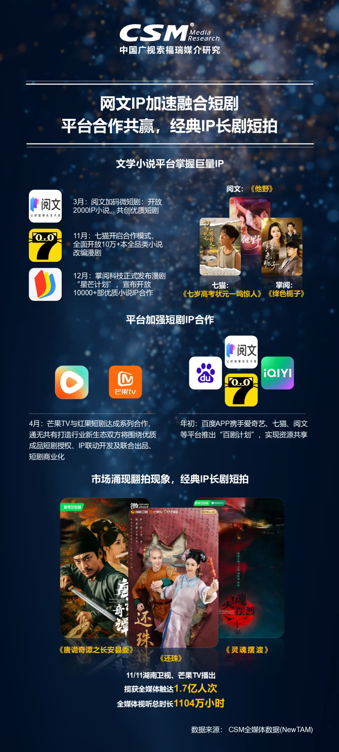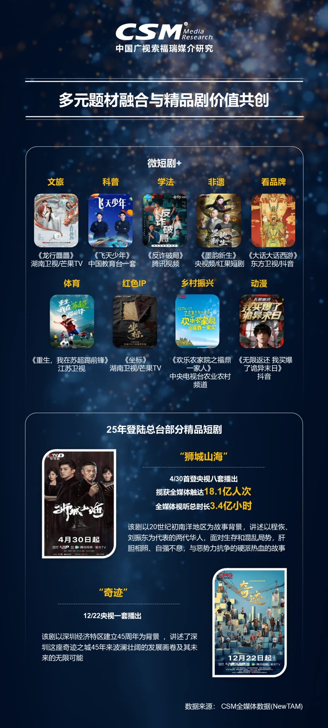 长剧、经典IP、网文纷纷跨界翻拍,长短剧联动放大IP影响力。“微短剧+”渗透文旅、非遗、科普、乡村振兴等垂类,与长剧形成互补,题材边界持续拓宽,多元化价值凸显。精品微短剧登陆总台等主流媒体播出,《狮城山海》揽获全媒体触达18.1亿人次、视听总时长3.4亿小时,完成了从圈层传播到破圈出圈的跨越,其精品价值与文化影响力得到进一步释放。