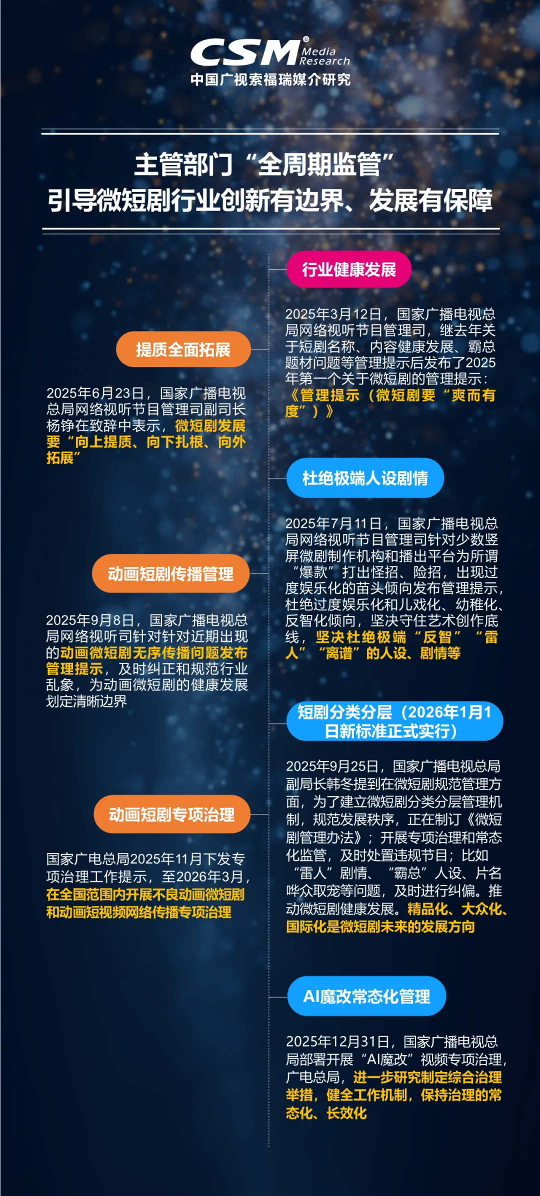 广电总局全周期监管整治极端人设、AI滥用等,明确“内容守正、技术向善”路径,推动行业在规范中创新,平台也持续加码治理整改力度,2025年,主要平台下架微短剧合计超8000部,平台相继推动各项精品化计划,深耕微短剧内容向精而行。