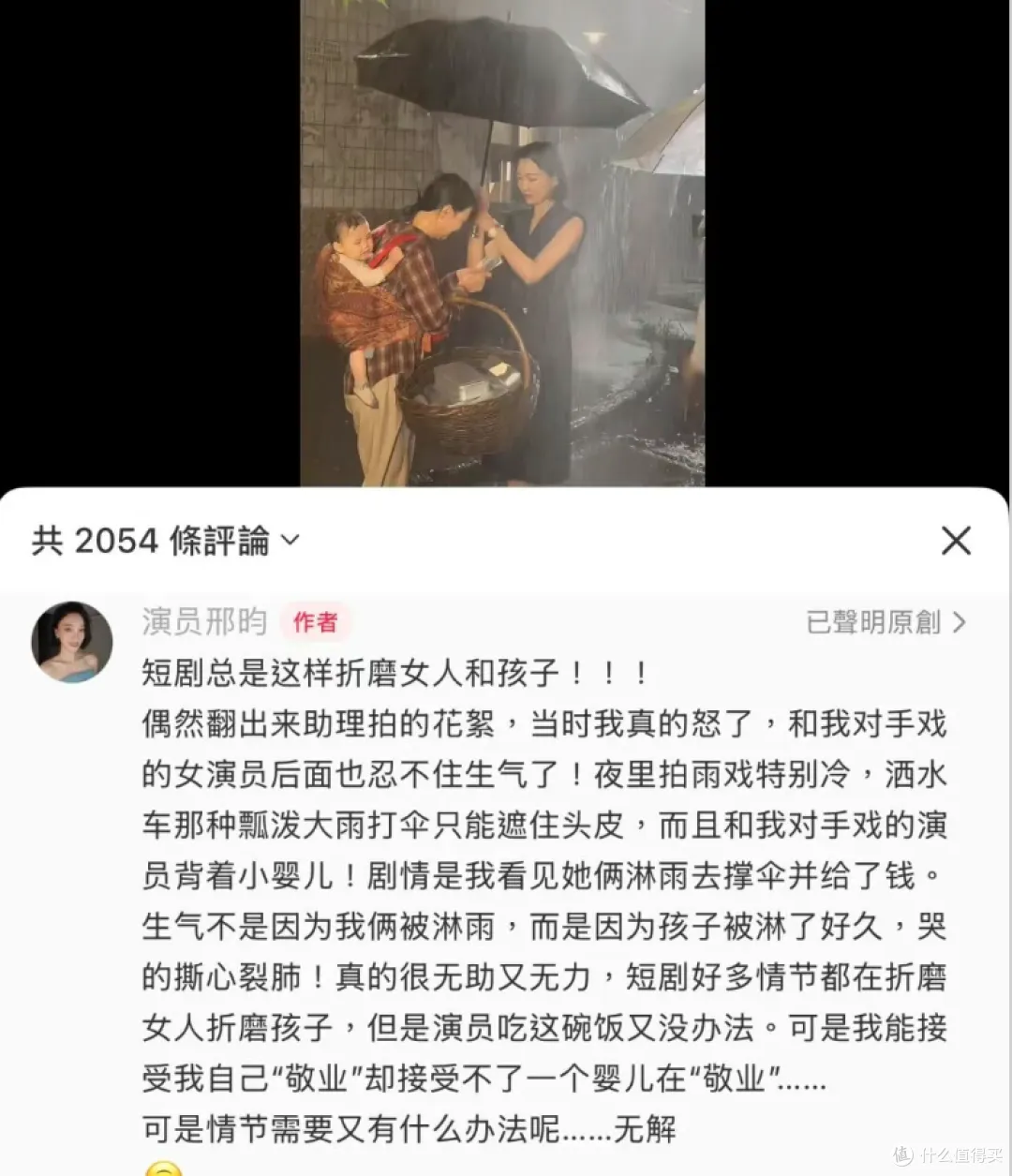 爆料的女演员叫邢昀,她发文说夜里拍雨戏本来就特别冷,剧组还用洒水车制造强降雨,那雨大得打伞只能遮住头皮。更离谱的是和她演对手戏的女演员背上还背着个婴儿。