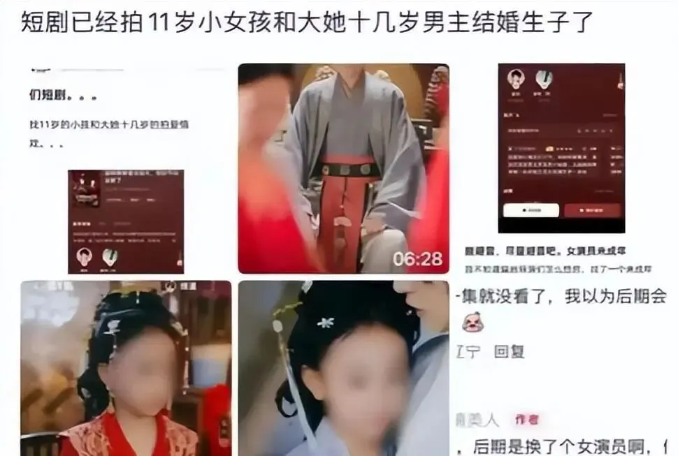 这并非孤例。 就在今年1月,短剧《逼锦鲤替嫁活阎王,相府气运全断了》因让11岁女童饰演“替嫁新娘”引发众怒。 剧中设定7岁被迫嫁人、15岁生子,还有成年男演员与女童的亲密戏份,满是“养成系”成人化隐喻。 尽管该剧已下架,但伤害已然造成。