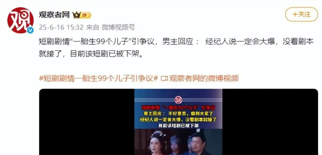 然而,繁荣背后是触目惊心的乱象。 2024年第二季度,广电总局下架的327部违规短剧中,45%存在暴力复仇、低俗婚恋、封建迷信等内容。 某“赘婿题材”短剧通过“男主当众羞辱岳父”“靠暴力解决商业纠纷”等剧情制造冲突,最终因违背公序良俗被下架。 更荒诞的是《麒麟送子天降喜福》,剧中女主一胎生下99个婴儿,婴儿被叠成“羊肉卷”造型抬走,播放量却高达4500万次。