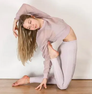 单腿轮式,需要练习者使用双手的力量支撑起躯干使得头部朝下,双手双脚撑地,身体向上拱起呈轮式练习中,保持脊柱下沉呈弧形,臀部内收上提,双膝微微弯曲,一只脚抬离地面向上伸直尽快拉伸腹部区域,体式可以有效强壮脊柱,矫正不良体态强化腹部核心肌肉群,促进代谢,有效排除体内毒素