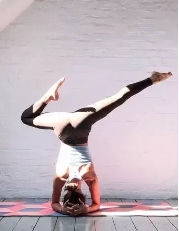 头手倒立变体,倒立变式之一,初学者不建议练习练习者从倒立姿势开始,双手贴紧耳边伸直撑地头部朝下,双腿并拢向上绷直,联系中双膝微微弯曲,臀部内收下沉双腿向下收,可以柔韧脊柱,伸直背部、胸腔腹部区域优雅体态,拉伸腹部,改善消化系统问题,促进代谢,纤细腰身