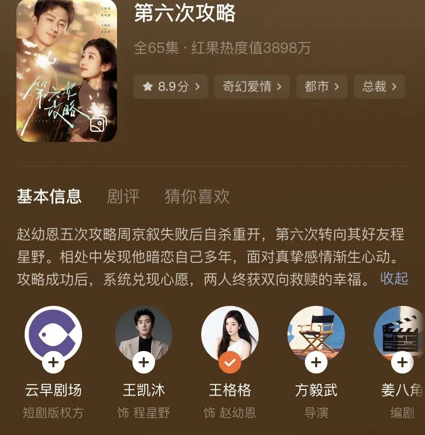 我真正被王格格圈粉,是在去年7月看《第六次攻略》被剧情吸引、同时被王格格和王凯沐的演绎所打动。看下图这剧情介绍,重生五次攻略一个人都失败,终于在第六次转去正确目标,双向奔赴。演技细腻,感人至深,值得一看。