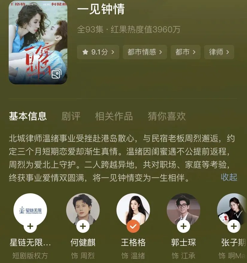 去年十月份王格格的一部《一见钟情》演的也特别好,堪称其代表作。马厩制片厂出品。与男演员何健麒合作。