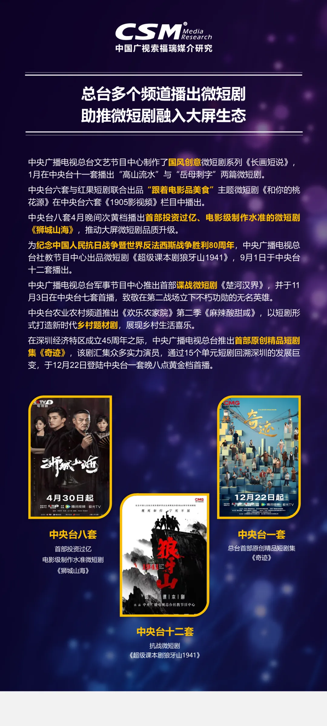 中央广播电视总台成为大屏微短剧的核心引擎,在央视一套、八套推出《奇迹》《狮城山海》等制作精良、题材多元的微短剧,将其纳入主流叙事体系,刷新行业品质标杆。央视频探索“微短剧+电商”新模式,央广网上线法治题材“惊奇剧场”并启动行业共建计划,CMG首届中国微短剧年度盛典落地烟台,设立权威奖项,推动行业向规范化、品牌化发展。