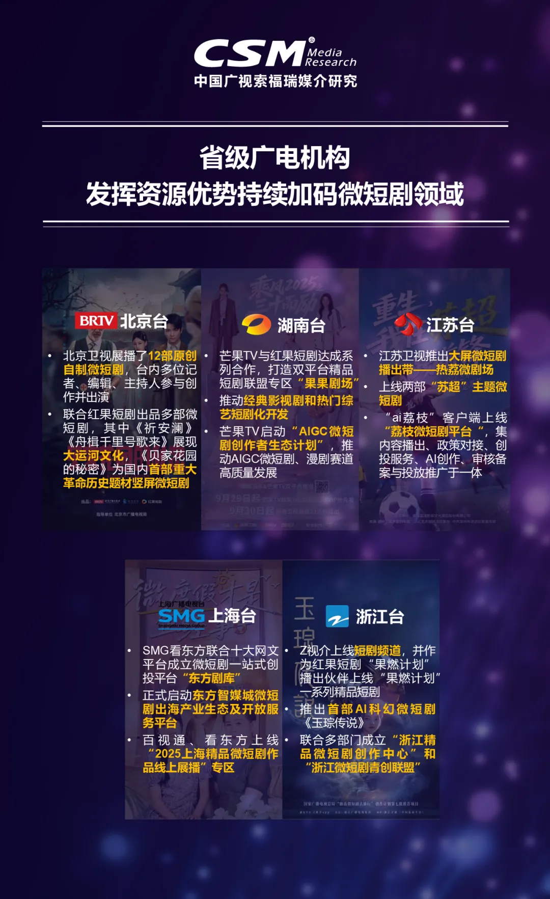 在微短剧行业蓬勃发展的浪潮中,地方广电机构凭借深厚的资源优势,从单一内容生产向生态化运营加速转型,成为推动行业升级的重要力量。各台纷纷打通产业链上下游,构建从孵化到分发的完整闭环;以技术驱动内容生产效率,探索微短剧创作、运营等新范式。