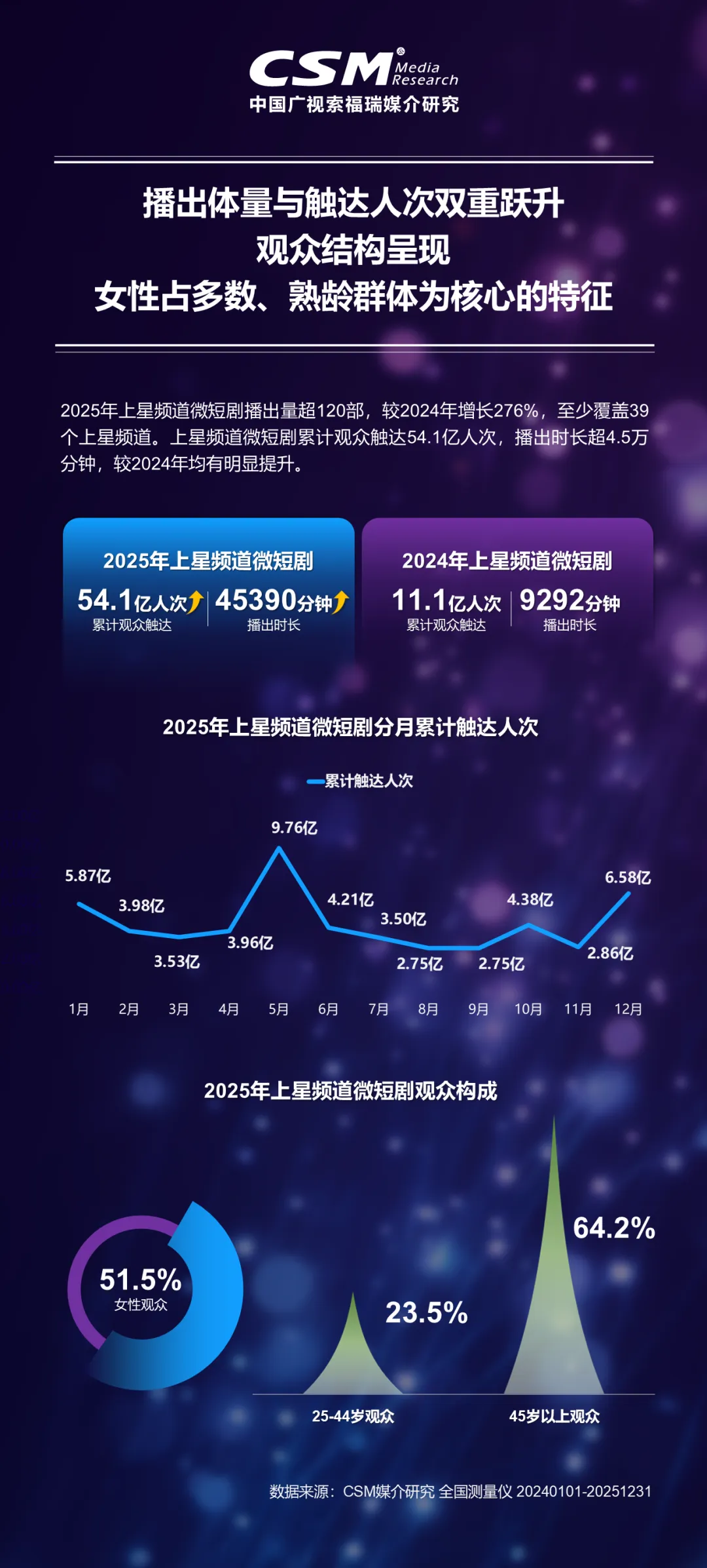 2025年,微短剧上星实现播出体量与观众触达的双重爆发式增长。上星频道微短剧播出量超120部,较2024年增长276%,覆盖至少39个上星频道;累计观众触达达54.1亿人次,较2024年的11.1亿人次实现数倍增长。观众特征明显,女性观众占比51.5%,是主要受众群体,45岁熟龄人群占比64.2%,成为大屏微短剧的核心人群。