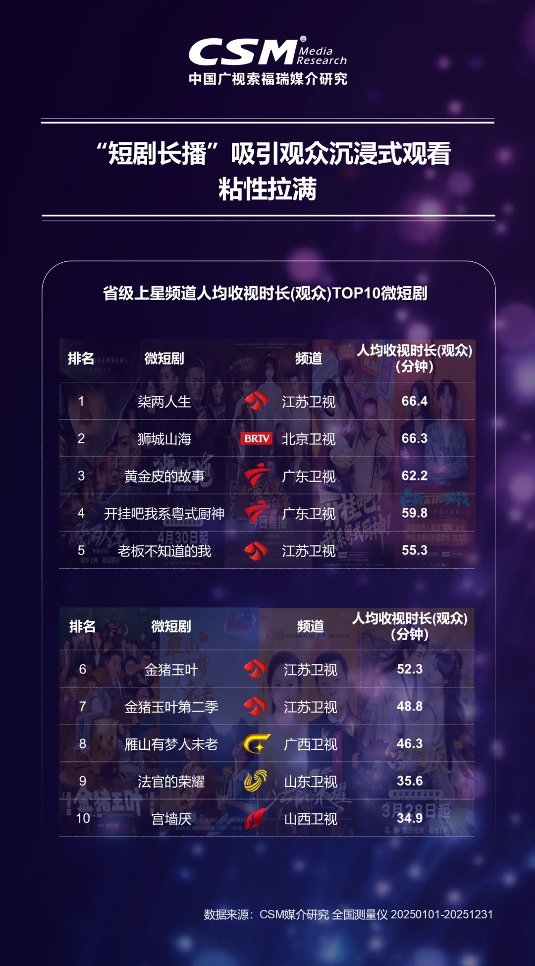 都市生活题材以28.4%占比居首,但同时也打破过去“言情+都市”双雄格局,新增奋斗励志、商战等8类题材方向,内容生态显著扩容,多元题材正在加速破圈。“短剧长播”模式验证了优质内容的沉浸力,江苏卫视《柒两人生》、广东卫视《黄金皮的故事》单集不到10分钟,全剧连播,人均收视时长超60分钟;紧凑节奏+强情节驱动,让微短剧真正“短而不浅,快而有料”。
