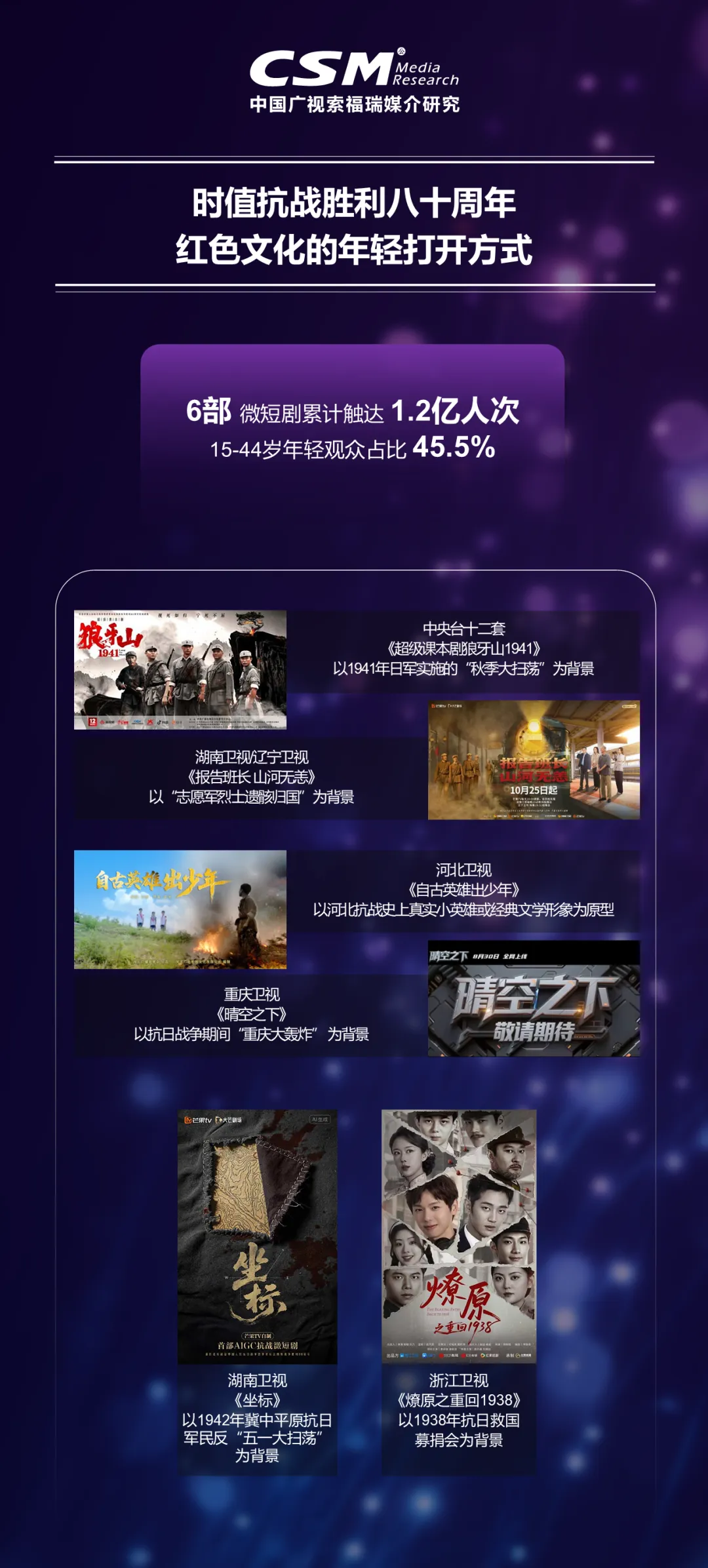 微短剧登陆大屏,在政策引导、技术赋能、主流媒体助推等环境下,已从单一内容产品升级为“内容+场景+商业”的生态接口,成为跨界融合的全链路纽带。上海东方卫视、湖南卫视《我是杜拉拉》《乘风2025之三十而励》等是综艺相关IP孵化的衍生剧,直接转化综艺粉丝,实现流量复用。浙江卫视《玉琮传说》试水AI生成科幻短剧;北京卫视《祈安澜》展现大运河文化;江苏卫视借“苏超”热点,《重生我在苏超踢前锋》精准触达球迷等群体,而安徽、广东卫视联合品牌推出定制剧,探索“内容即消费”的新路径。微短剧也成为红色文化的年轻打开方式,部分省级广电6部红色微短剧累计触达1.2亿人次,其中15–44岁观众占比45.5%。