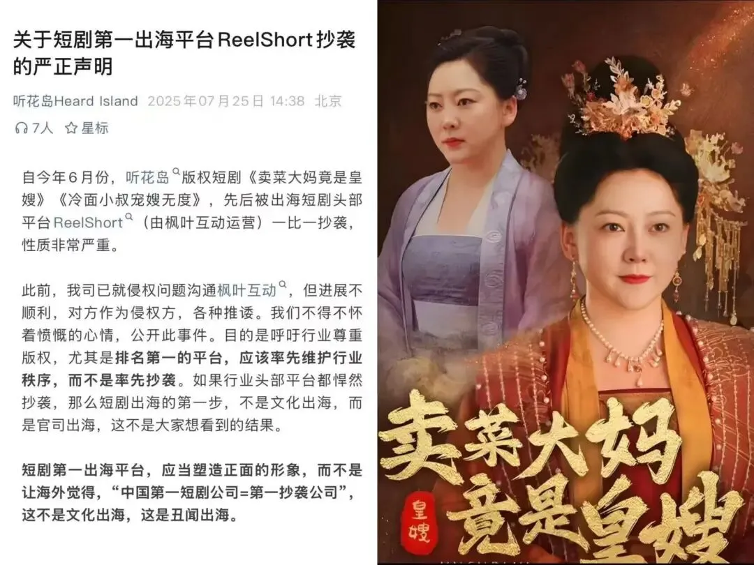前段时间,国内的头部短剧公司听花岛发布了一份声明,指责短剧出海的头部公司Reelshort抄袭听花岛版权短剧《卖菜大妈竟是皇嫂》等。从结果来看,除了公开指责,听花岛并没有取得实质上的维权进展。