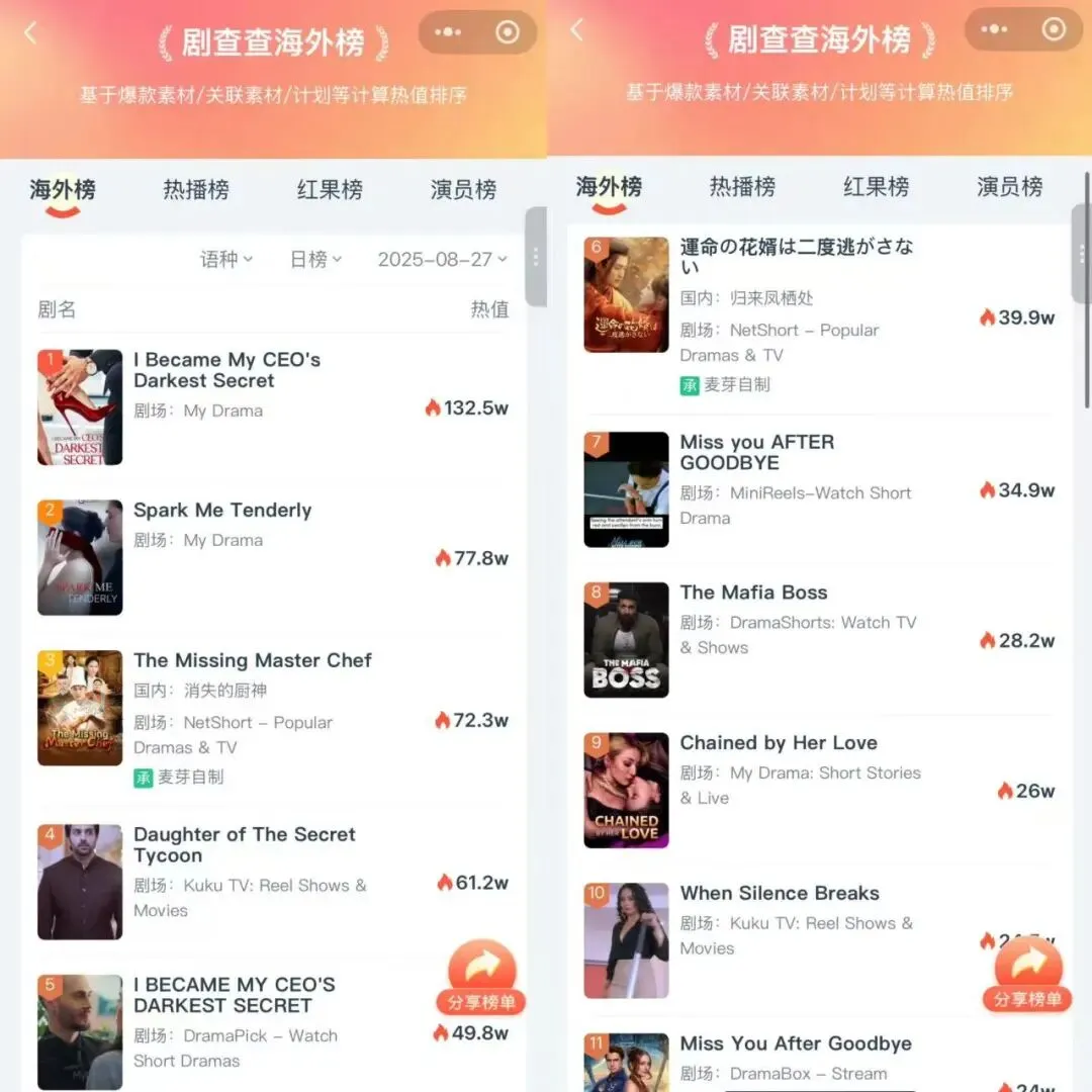 不过,随着近两年,字节加大对免费短剧APP红果的投入,红果迅速抢占市场份额,大幅挤压了付费短剧盈利空间。与此同时,短视频平台也出台政策限制投流公司的资质,堵死了很多头部公司赚钱的路子。一些头部公司只能背水一战,开拓海外市场。