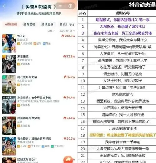 新榜发布的“抖音AI短剧榜”显示,类似的题材如《奶团太后宫心计》也取得了成功。这份榜单反映了AI真人短剧的现状,与AI漫剧的热门榜单相比,有着明显的差异。