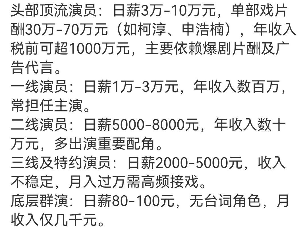 三线及特约演员,日薪能有500到5000块不等,但得有作品背书,还随时可能被替代,收入不稳定,没有安全感。