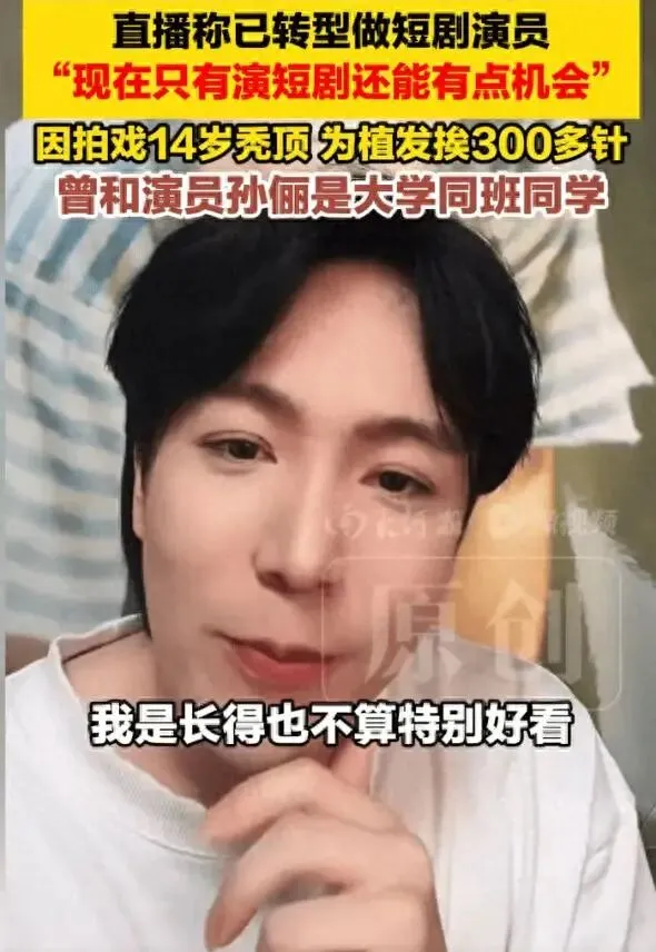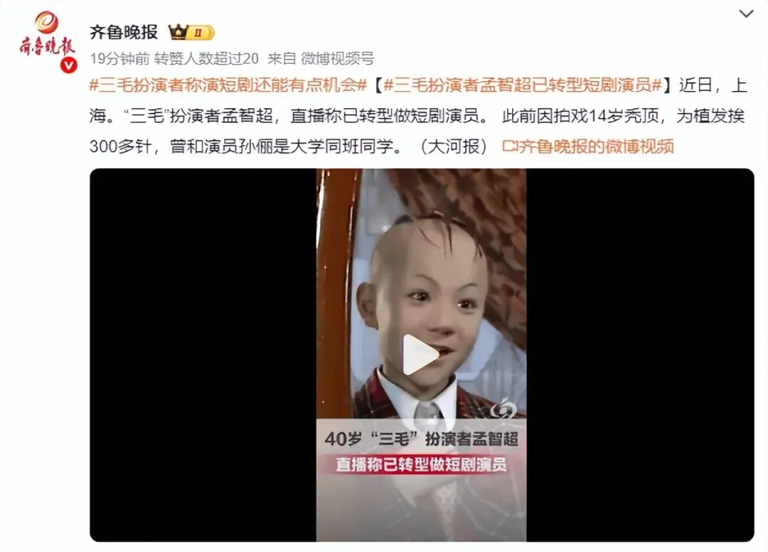 近日,“三毛”扮演者孟智超在直播中称已转型做短剧演员。此前,孟智超因拍戏14岁秃顶,为植发挨300多针,曾和演员孙俪是大学同班同学。