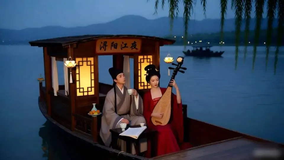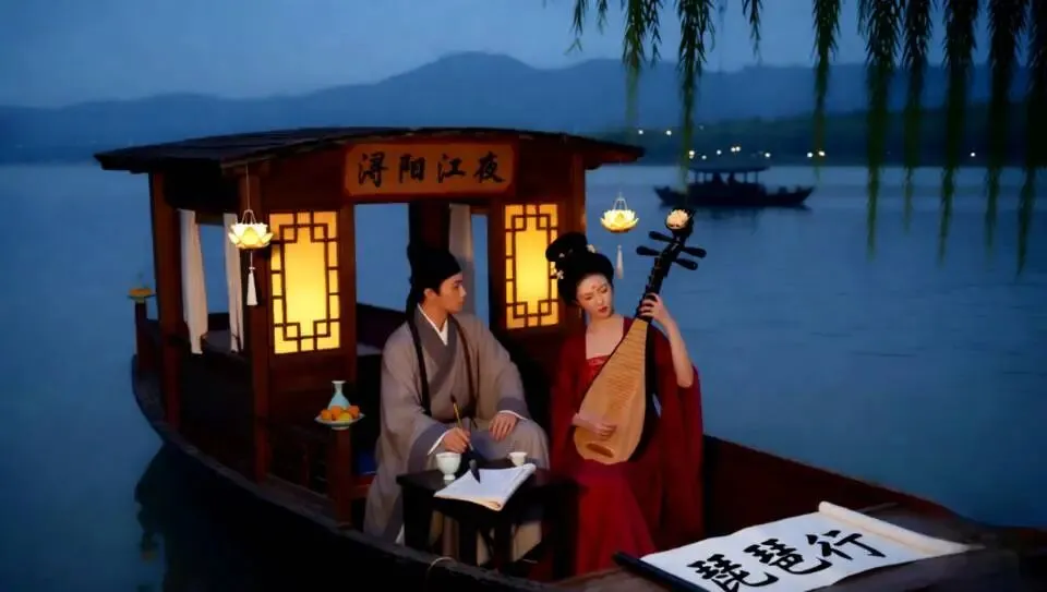 白居易:(将诗稿递给琵琶女)这便是我为你写的诗,名为《琵琶行》。愿这诗与你的曲,能传之后世,让世人知晓,这江州月夜,曾有一位绝代佳人,弹奏过这世间最动人的乐章。