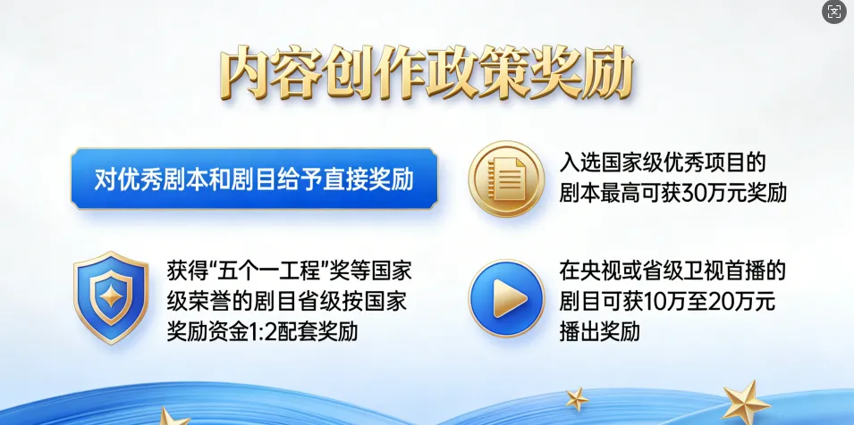 在内容创作方面,政策提出对优秀剧本和剧目给予直接奖励。例如,入选国家级优秀项目的剧本最高可获30万元奖励;获得“五个一工程”奖等国家级荣誉的剧目,省级将按国家奖励资金给予1:2配套奖励;在央视或省级卫视首播的剧目,也可获得10万至20万元不等的播出奖励。