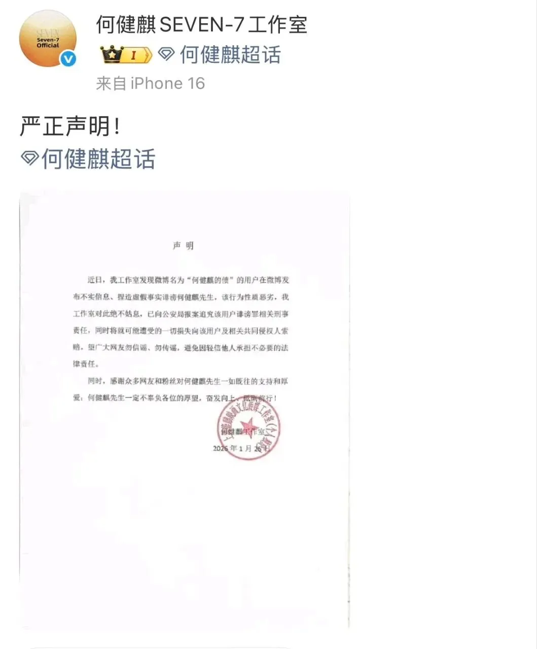 后续何健麒工作室发声明表示其诽谤并已🚔