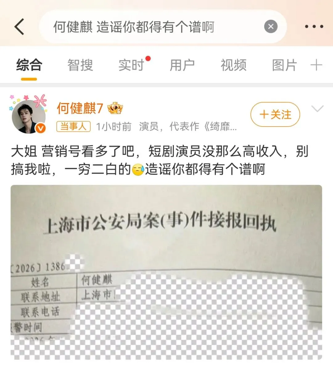 何健麒也发博回应“大姐 …短剧演员没那么高收入,一清二白”