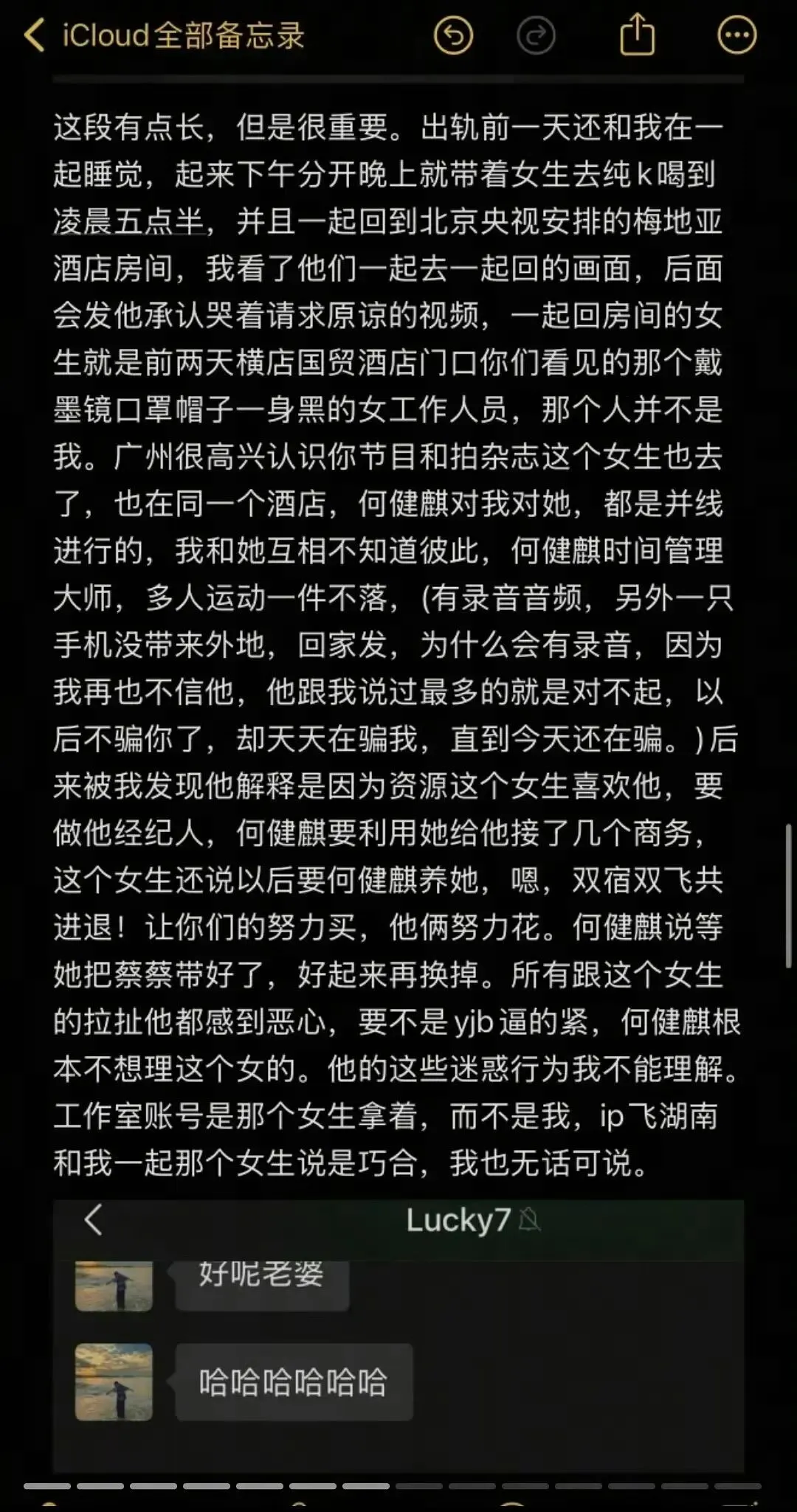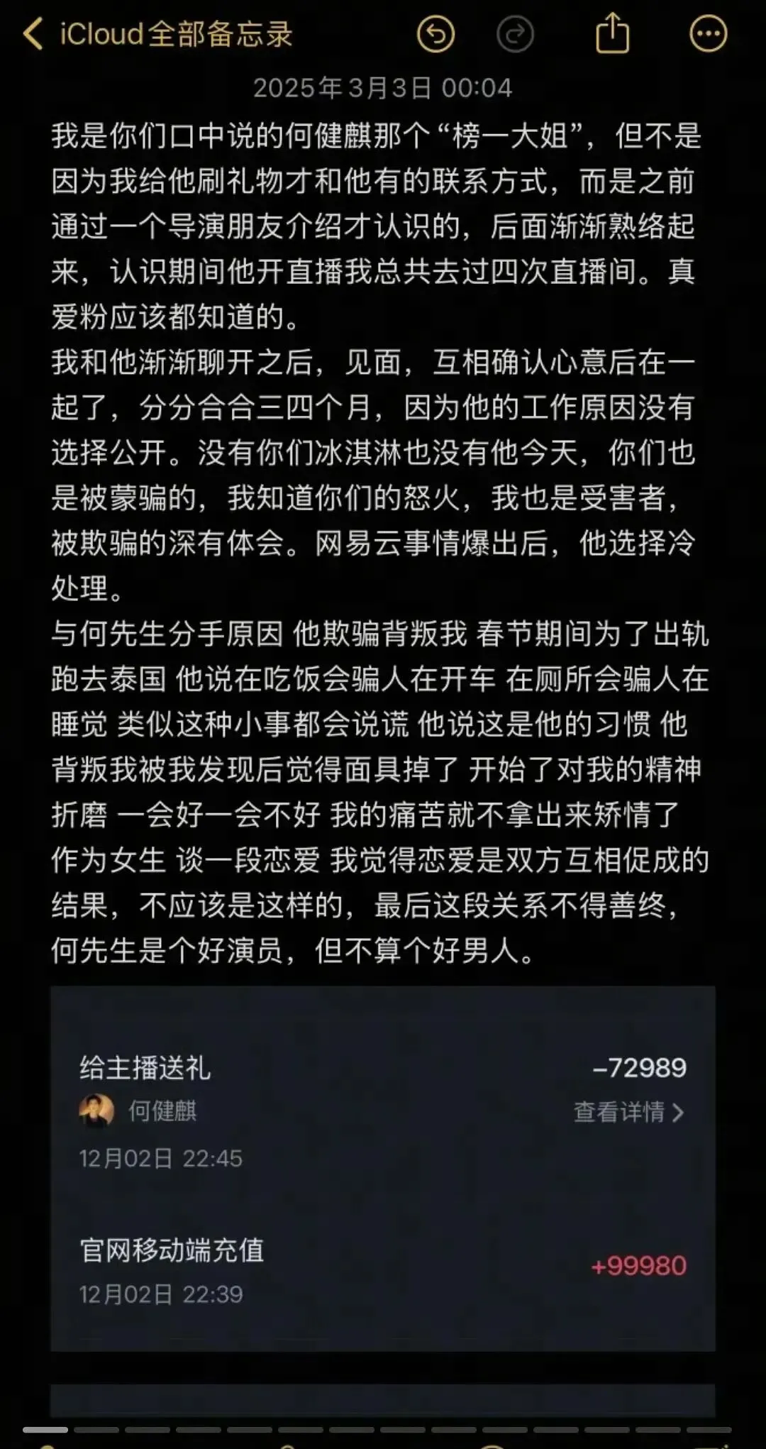 何健麒在25年本来事业前途大好,还受邀准备出演长剧配角。但在3月, “榜一大姐”龙女士发微博和照片控诉何健麒出轨劈腿:何健麒曾经和她在一起过,并且在一起后花了不少钱,最后因为发现他劈腿出轨最后分手。