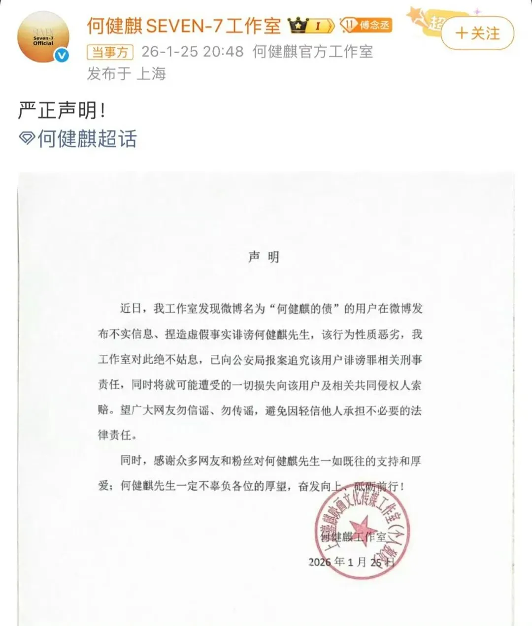 何健麒工作室发布声明:称对方捏造虚假事实诽谤,已向公安局报案追究诽谤罪刑事责任,并索赔损失。