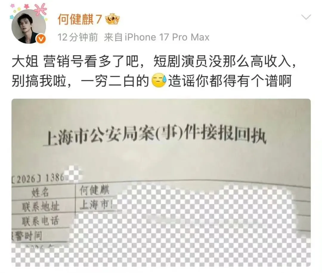 本人火速否认回应:晒出上海市公安局接报回执(编号〔2026〕1386),配文“短剧演员没那么高收入,一穷二白经不起造谣”。