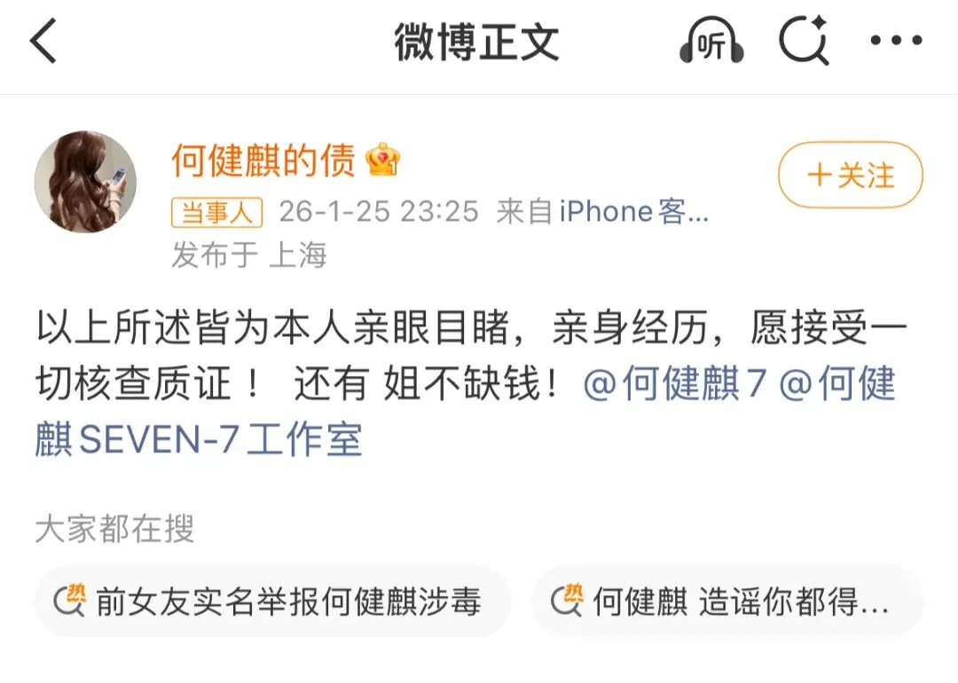 何健麒因为《一见钟情》播得很不错在工作上顺利续命,个人私德问题小小影响事业又可以重新开始。结果今年1月25日,自称何健麒前女友的用户"何健麒的债"手持身份证发布视频,实名举报其2021年同居期间多次吸毒。指控包括: