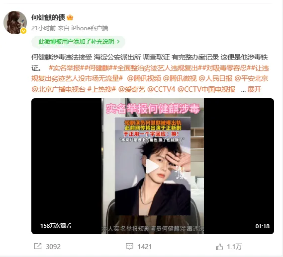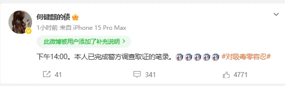 此前,@何健麒的债 发文指控内容包括:2021年同居期间多次吸毒;2021年10月因涉毒被北京海淀警方带走,接受尿检、血检和毛发检测,办案记录留存于海淀公安执法办案管理中心;为掩盖检测痕迹剃发,后期以接发辫子造型掩饰……随后,@何健麒SEVEN-7工作室 发布严正声明,称已向公安局报案并追究该用户诽谤罪及相关刑事责任。