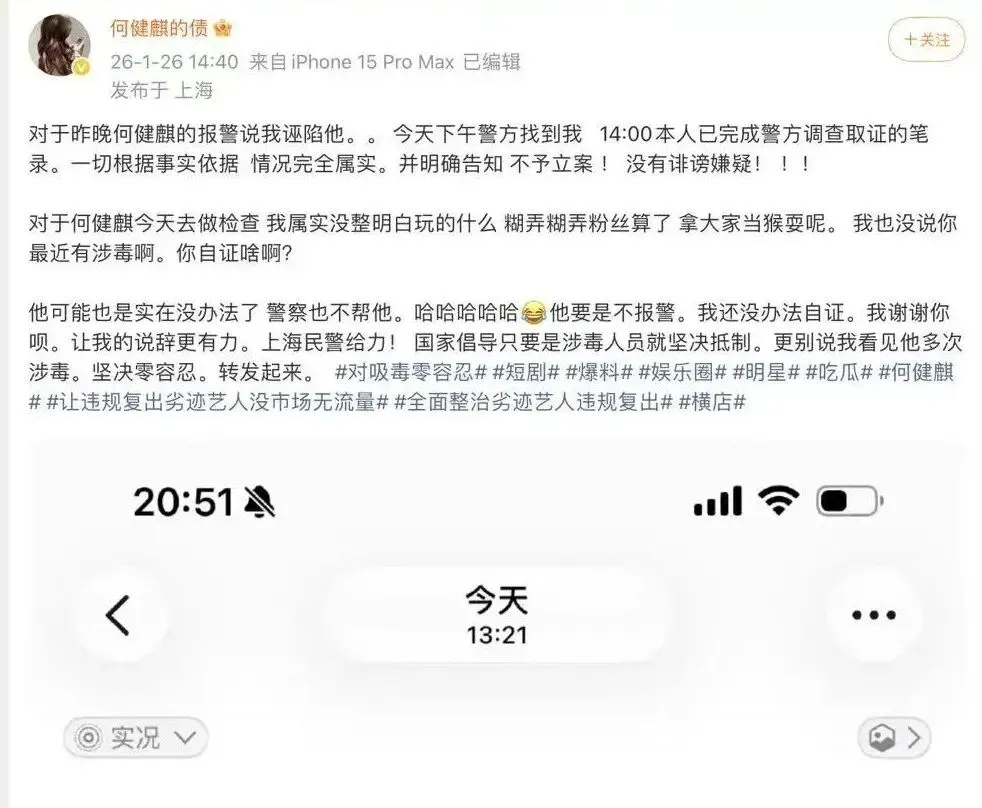 然而事情到这还没有结束,舆论持续发酵后,何健麒又于今天发博,表示已经接受尿检。