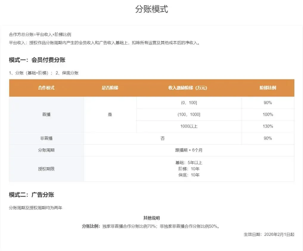 2026年2月1日公布了关于短剧入住爱奇艺最新分账模式和资质要求