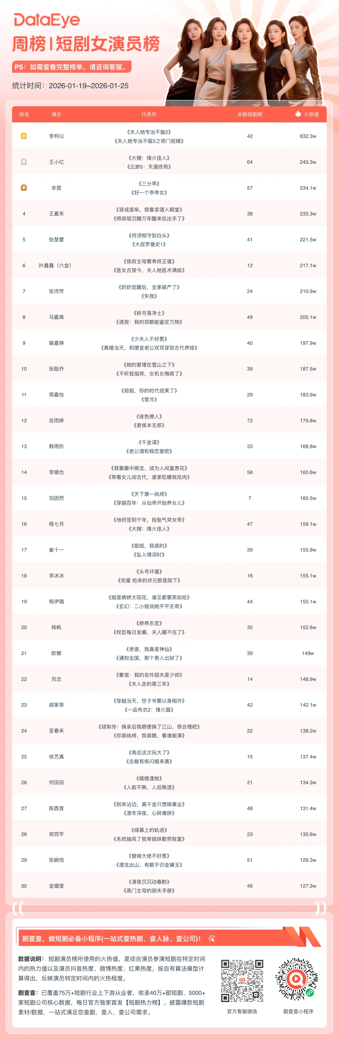 本期(1月19日-1月25日)DataEye微短剧女演员热榜,李柯以位居第一。