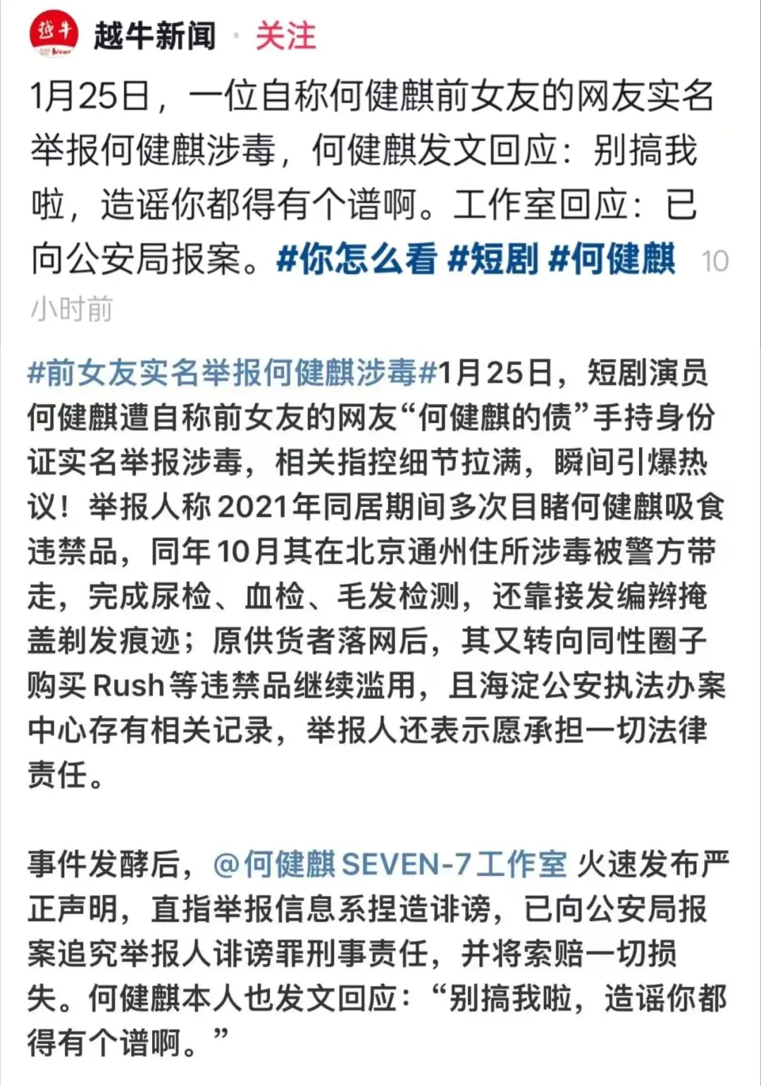 前女友举报短剧演员何健麒涉毒,曾被警方带走检测,现发文回应!