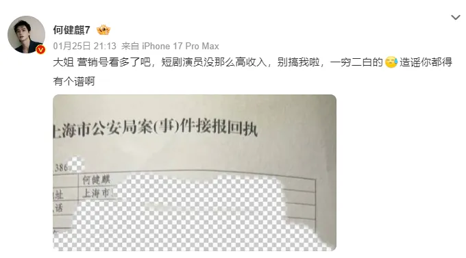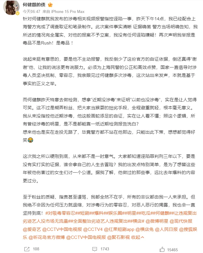 针对何健麒就我发布的涉毒相关视频报警指控诬陷一事,昨天下午14点,我已经配合上海警方完成了调查取证和笔录制作。此次案件事实清晰 证据确凿 警方当场明确告知,我所述的情况完全属实、对他的报案不予立案,我没有任何诬陷嫌疑!再次声明我举报是毒品不是Rush!是毒品 !说起来挺有意思的,要是他不主动报警,我反倒少了这份官方的自证依据,倒还真得“谢谢”他,让我的说法更有说服力。必须为上海民警的公正和高效点赞,国家一直倡导对涉毒人员坚决抵制、零容忍,我亲眼见过何健麒多次涉毒,这次站出来发声,本就是基于事实的正义之举。而何健麒昨天特意去做检测,想拿“近期没涉毒”来证明“以前也没涉毒”,实在是让人觉得可笑。这不过是糊弄粉丝、把大家当猴耍的拙劣手段,全程避重就轻,根本毫无意义。我从来没指控他近期涉毒,他这般画蛇添足的自证,实在让人看不懂;照这个逻辑,所有曾经涉毒的明星,是不是都能靠一纸近期检测报告洗白?想来他也是实在走投无路了,毕竟警方都不站在他那边,只能出此下策,想想都觉得好笑😂这次我之所以硬刚到底,从来都不是一时意气。大家都知道诬陷罪判刑三年以下,要是没有实打实的证据,谁会拿自己的人生去冒险?我的出发点特别简单,是为了想替这些年被他伤害过的女生们讨一个公道。据我了解,他做过的那些事,远比去年爆料的内容更过分。至于粉丝的质疑、指责甚至谩骂,我都全然不在乎,所有的非议都由我一人来承担。但我绝不会因为任何压力就退缩,对涉毒行为的零容忍,对恶人恶行的揭露,我也会一直坚持到底!