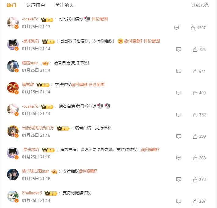 评论区应该基本上都是何健麒的粉丝,直白一些的直接“支持哥哥相信哥哥”,含蓄一点的表达是“清者自清支持维权”。
