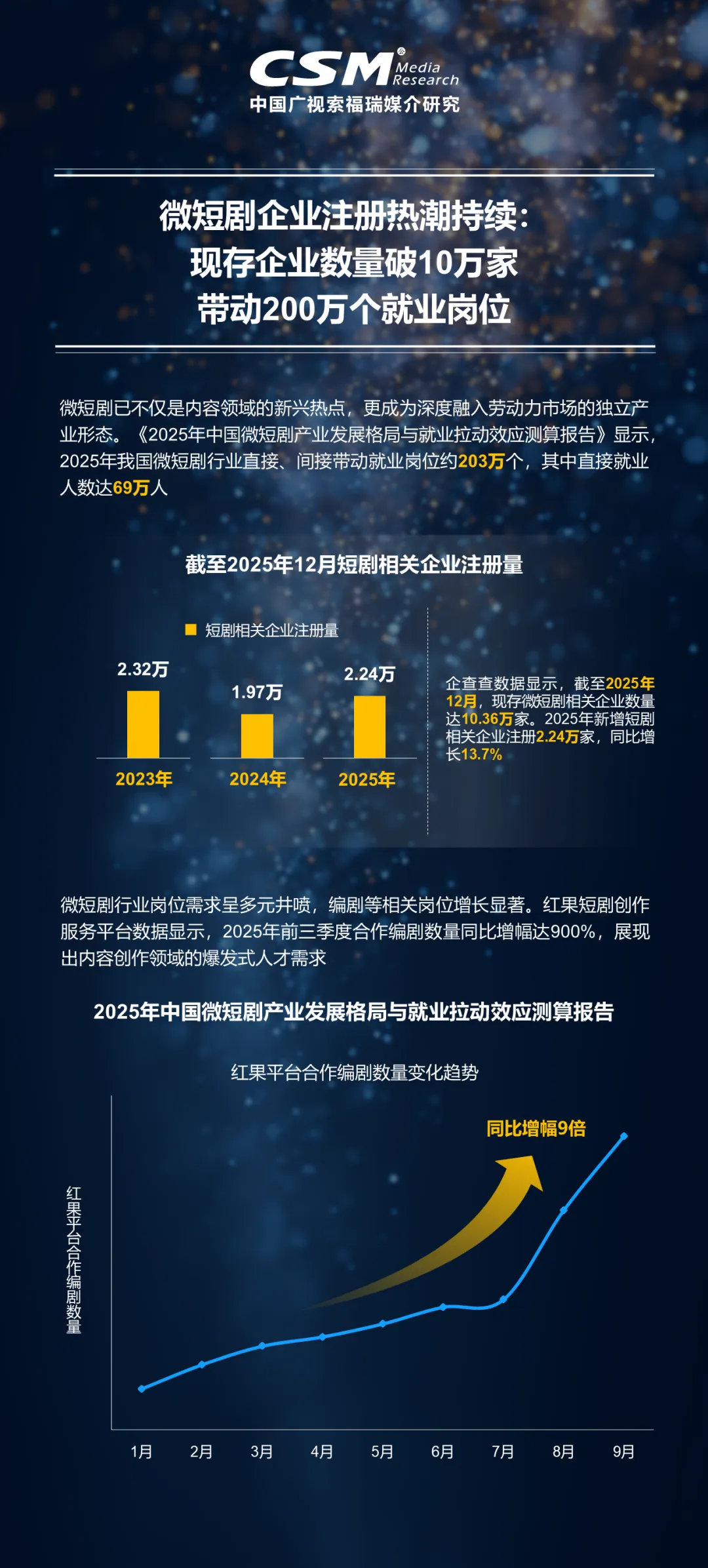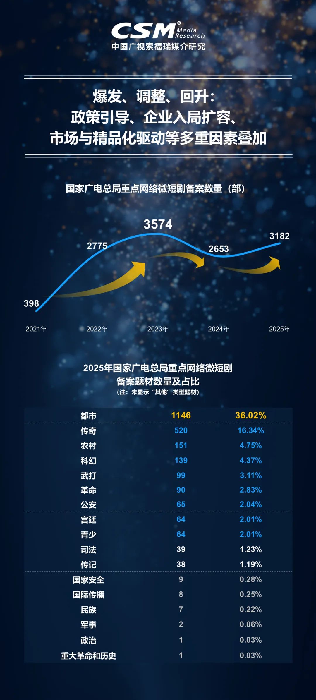 用户规模从2024年4.37亿飙升至6.28亿;“喜欢微短剧的用户”较去年增长9.7%;44.2%用户预期增加微短剧观看时长。在政策引导、企业入局扩容、市场与精品化驱动等多因素叠加下促成“减量提质”后重拾增长势能,微短剧备案数量同比增长20%达3182部;内容供给向都市、传奇等题材聚焦,而相关企业数量破10万家,直接间接带动200万岗位就业,价值效益凸显。