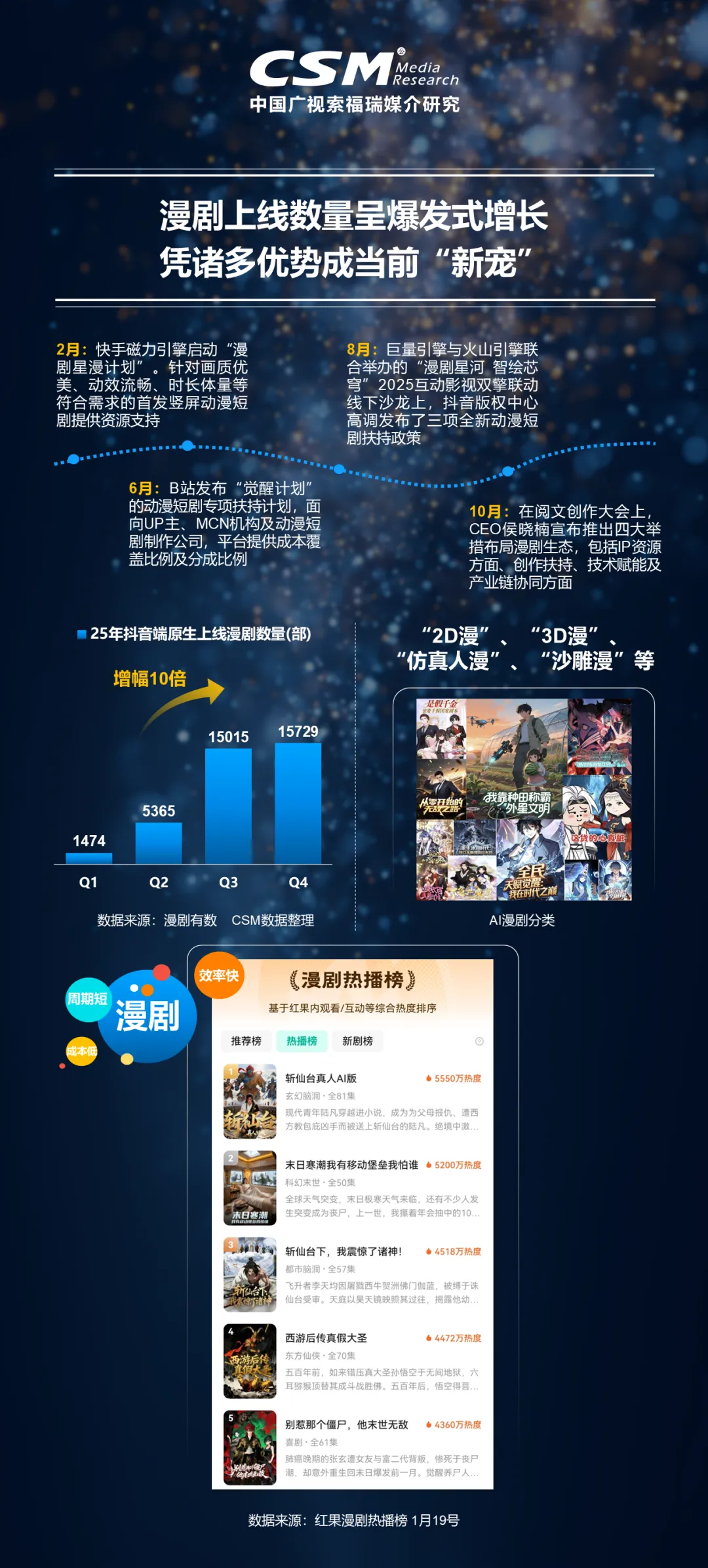 文心一格、阿里千问等AI工具开放迭代,直接拉低漫剧制作成本,快手、抖音、红果等平台集体加码布局。漫剧凭“低成本、快效率、短周期”等优势异军突起,实现规模化内容产出,全年AI漫剧数量呈爆发式增长,“2D/3D漫”“仿真人漫”“沙雕漫”等类型漫剧层出不穷;堪称“AI漫剧元年”。