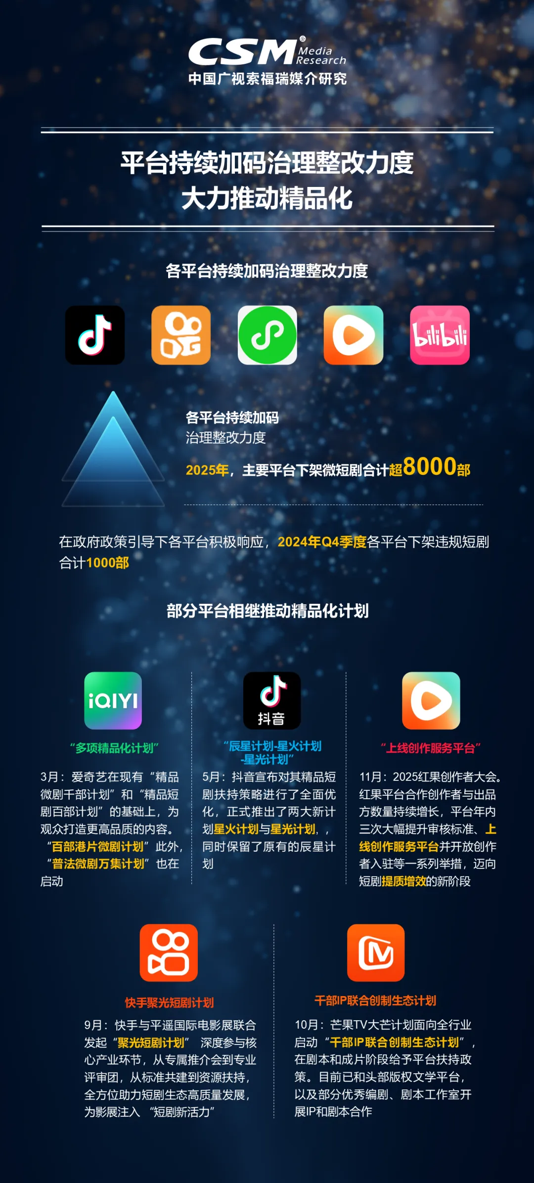 广电总局全周期监管整治极端人设、AI滥用等,明确“内容守正、技术向善”路径,推动行业在规范中创新,平台也持续加码治理整改力度,2025年,主要平台下架微短剧合计超8000部,平台相继推动各项精品化计划,深耕微短剧内容向精而行。