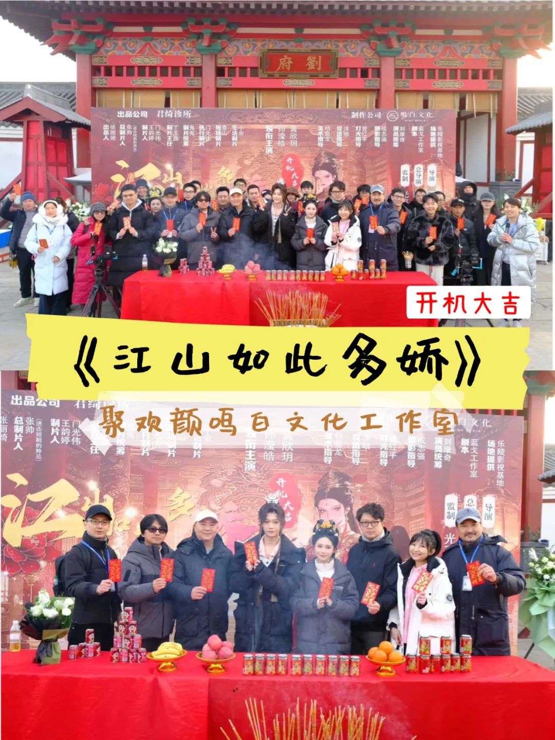 🎬《江山如此多娇》在古色古香的“刘府”门前正式开机。出品方聚欢颜厂牌【鸣白文化工作室】的主创团队全员集结,主演孙滢皓、黄欣玥手持红包站在C位,身后“开机大吉”的红色背景板在冬日阳光下格外醒目,剧组用最仪式感的方式开启了这段权谋之旅。