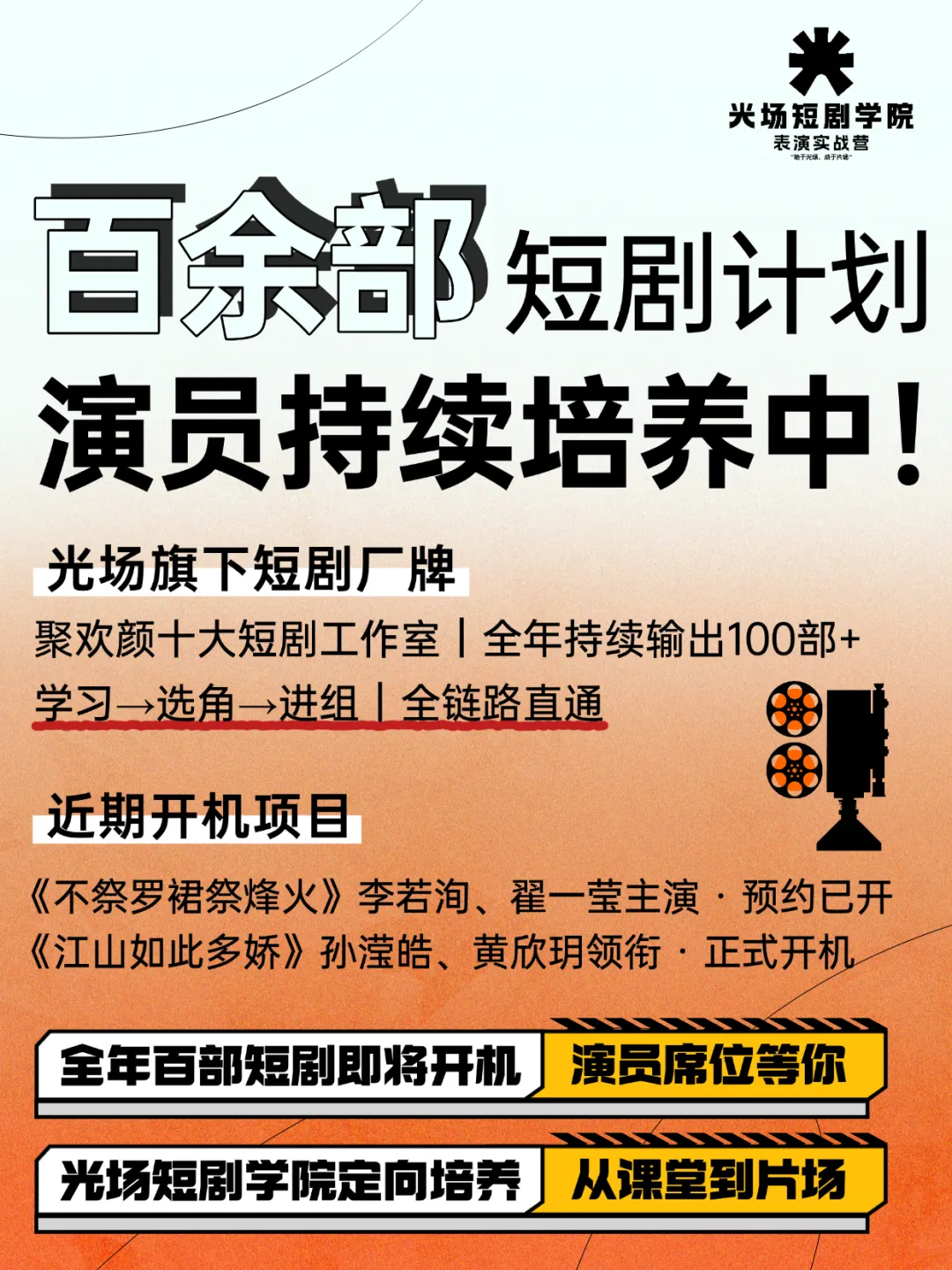 玩法很直接:5天实战集训+1天选角,考核通过就有机会直通合作剧组。更吸引人的是,我们背后站着聚欢颜厂牌——旗下八大短剧工作室,全年产出100+短剧,这意味着一辆持续发车的“演员直通车”。