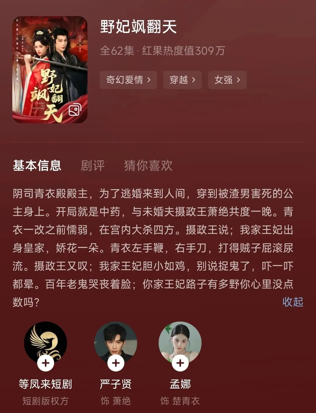 附《野妃飒翻天》孟娜&严子贤,剧情节奏紧凑,内容还成,爱情线尚不明显,目前还是纯对抗路,如果有第二季的话,估摸感情进展能更明显些。