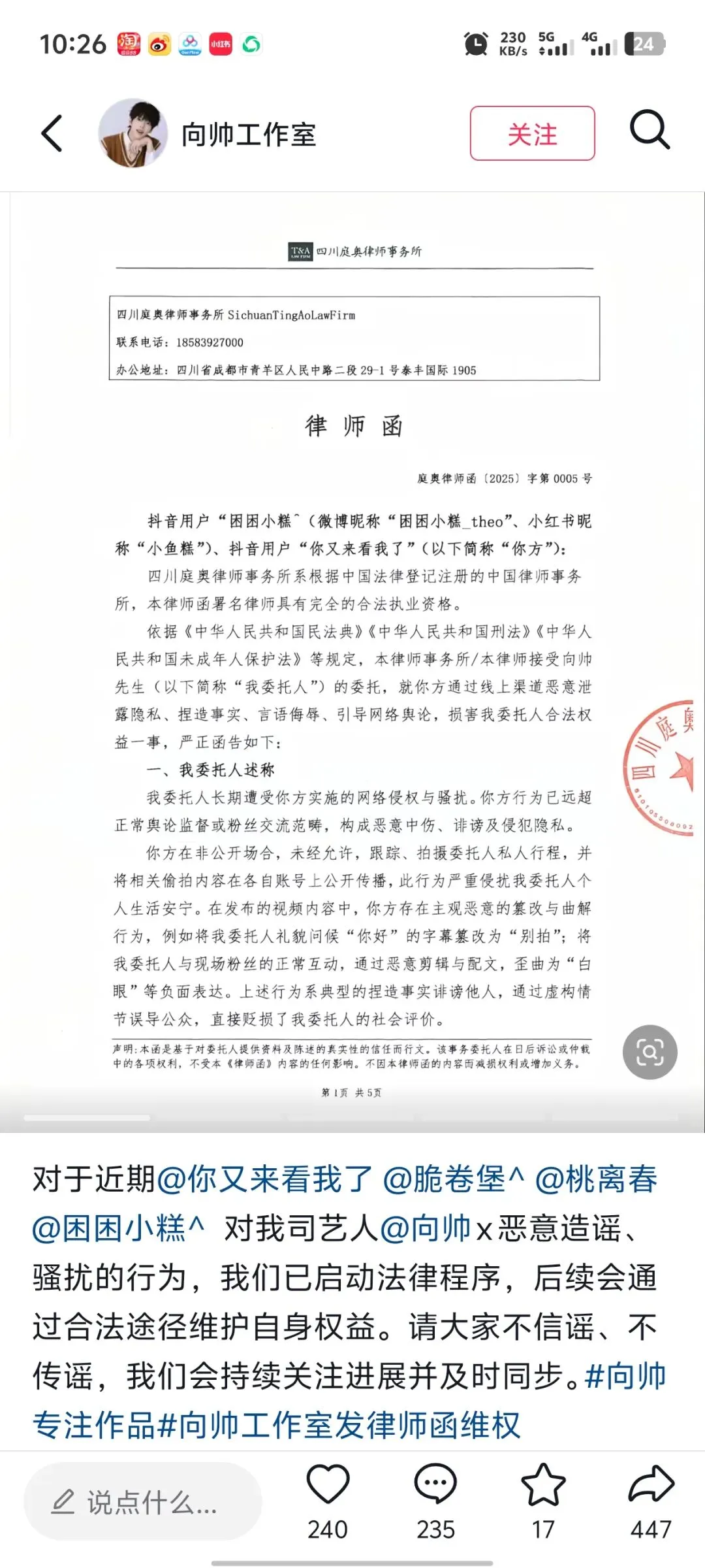 向帅工作室在某平台发布律师函,将起诉四位剧粉!(并且配上不要脸,太不要脸了bgm,但是向帅工作室表示是系统自动配bgm,现在已经改了bgm)(图2.3)