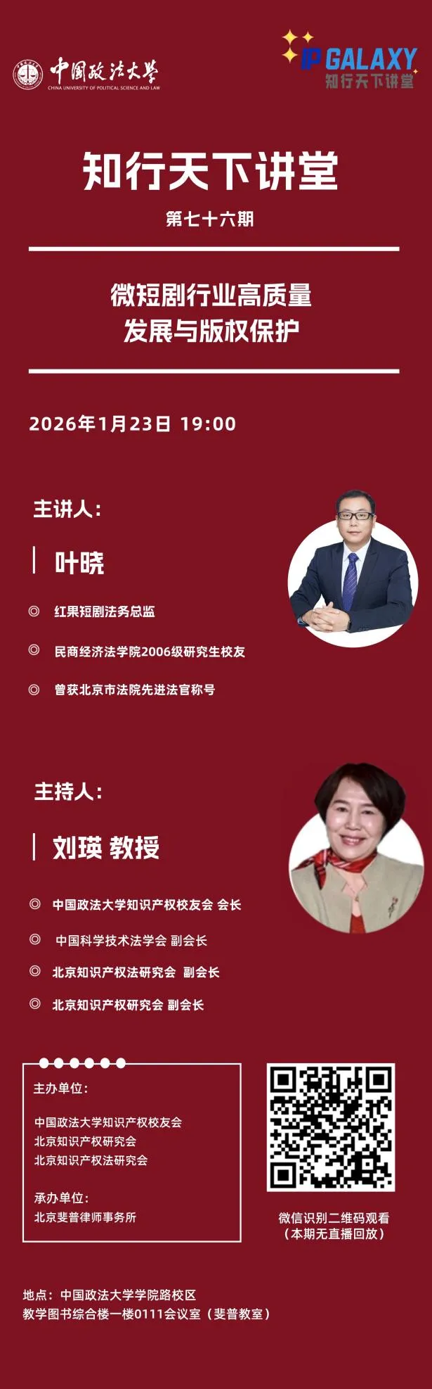 第七十六期讲堂活动荣幸邀请到红果短剧法务总监 叶晓老师,带来“微短剧行业高质量发展”主题讲座。中国政法大学知识产权校友会会长、中国科学技术法学会副会长、北京知识产权法研究会副会长、北京知识产权研究会副会长刘瑛担任本期讲堂活动主持人。